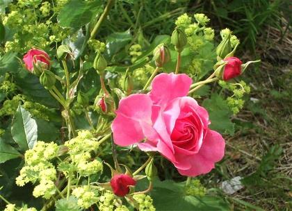 Die Buschrose "Heidekönigin", begleitet von weichem Frauenmantel (Hamamelis mollis)
